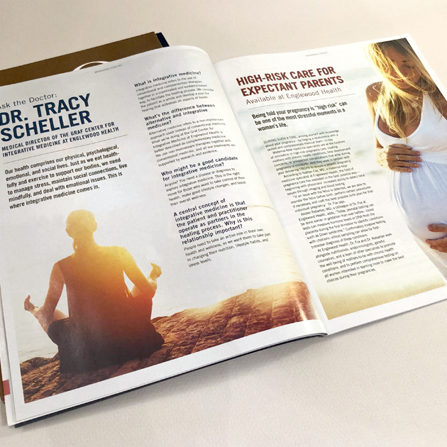 I designed these "Sponsored Content" ads for Englewood Health which ran in the annual Bergen Guide. The spread and single right-hand page ads were meant to appear as editorial content within the publication and promote the innovative health services offered at the hospital. I searched for images that would correlate to the articles' subject matter—and found photos that were inviting and positive; this ensured that the type-heavy content was still aesthetically pleasing and emphasized that patients can expect outstanding care at Englewood Health.